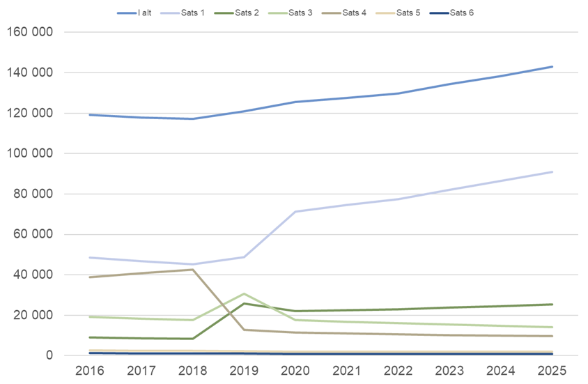 Også bruken av sats 3 har vært påvirket av regelendringene. Andelen med sats 3 økte fra 15 prosent i 2018 til 25 prosent i 2019. Deretter har andelen sunket, og i 2025 mottok om lag 10 prosent av alle med grunnstønad sats 3 (14 200 personer).