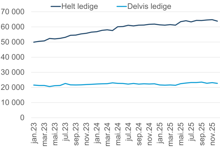 De ujusterte tallene viser at det i desember var 62 400 personer registrert som helt arbeidsledige hos Nav. Det tilsvarer 2,1 prosent av arbeidsstyrken. I tillegg til de helt ledige var det 23 900 personer som var delvis ledige (0,8 prosent), og 10 700 som var arbeidssøkere på tiltak (0,4 prosent).