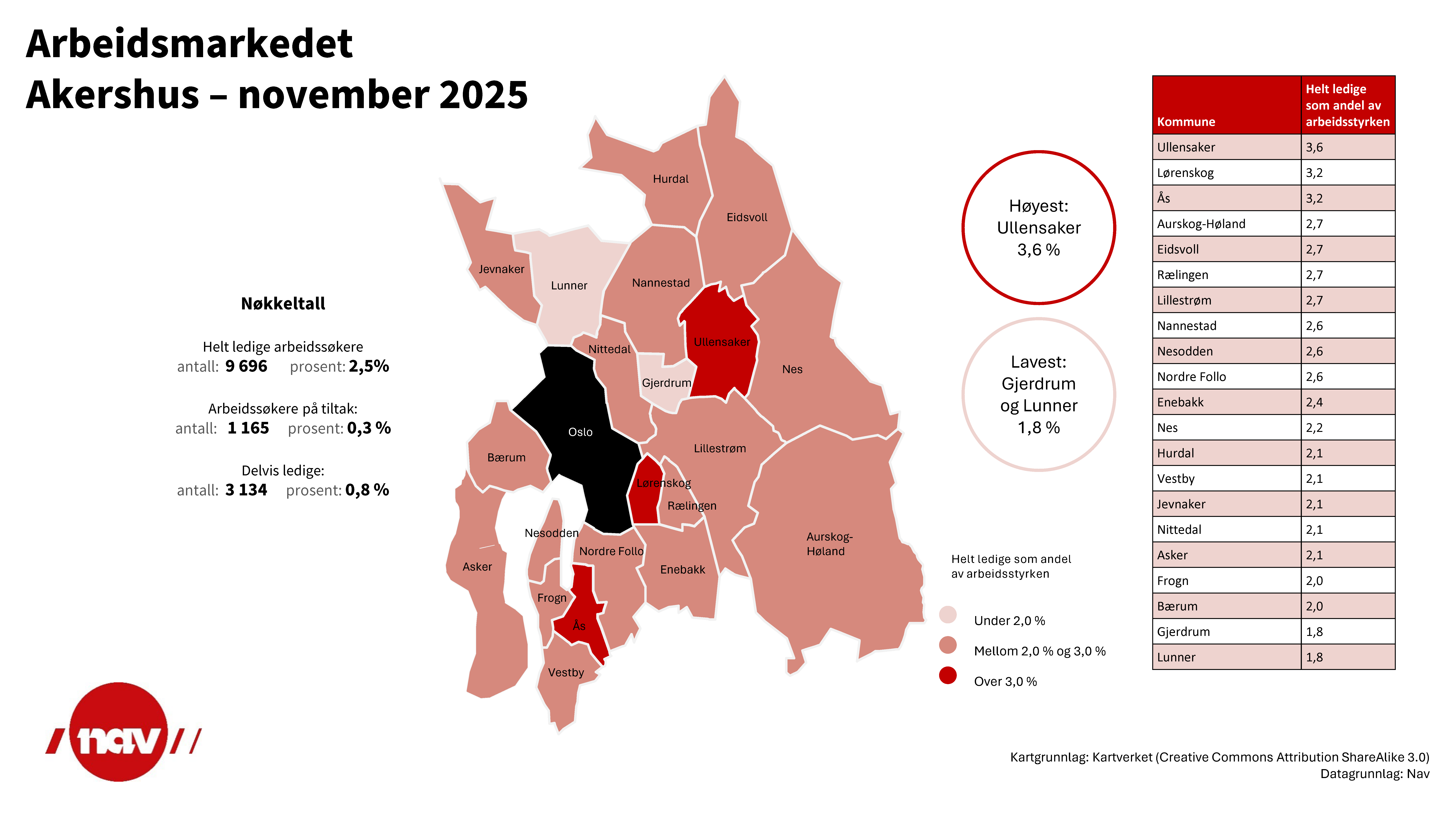 Ullensaker har høyest andel helt ledige av kommunene i Akershus med 3,6 prosent, mens Gjerdrum og Lunner har lavest andel, begge med 1,8 prosent helt ledige.