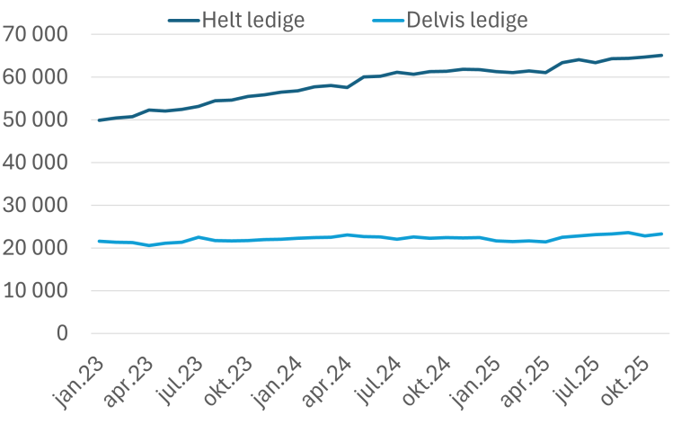 Figur 1. Antall helt ledige og delvis ledige. Sesongjusterte tall. Januar 2023-november 2025